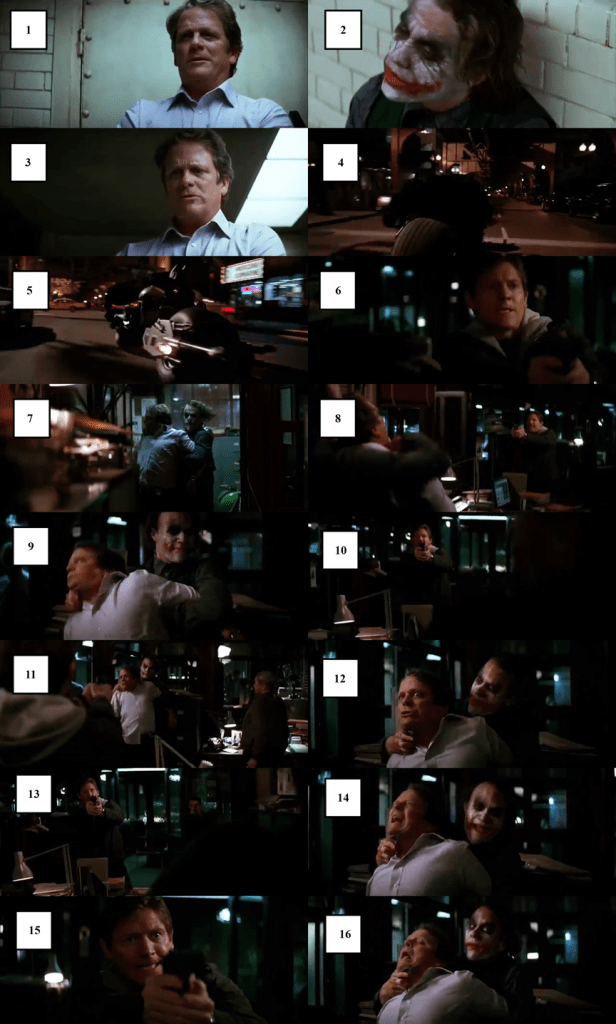 One sequence in particular which highlights how Nolan’s work in ‘The Dark Knight‘ matches up with these trends is the sequence in which we see how the Joker escapes from police custody. While the Joker executes his escape plan we are simulaneously being shown Batman and Lt. James Gordon speeding across Gotham, Harvey Dent and Rachel confessing their love to each other via radio while tied up and facing impending death, and the Joker’s henchman who is rigged to blow up being searched by the police. The ordering of the narrative strands which make up this section seem to be fragmented with little regard for continuity or rhythm, reshuffling the fragments into a different order would have little effect on the scene. However, the Joker’s escape from police custody is the most difficult thread to follow. The Jokers escape begins with him taunting the guard tasked with keeping him in his cell into approaching him, we then cut to a brief 5 second moment of Batman speeding through Gotham traffic, followed by a shot of a character the film hasn’t introduced us to in an office space we aren’t familiar with, reacting to something off-screen. It is soon revealed that this off-screen action the character is reacting to is the Joker holding his guard hostage with a blade to his throat, making his way into the office space and demanding his phone call (shots 1 to 13).