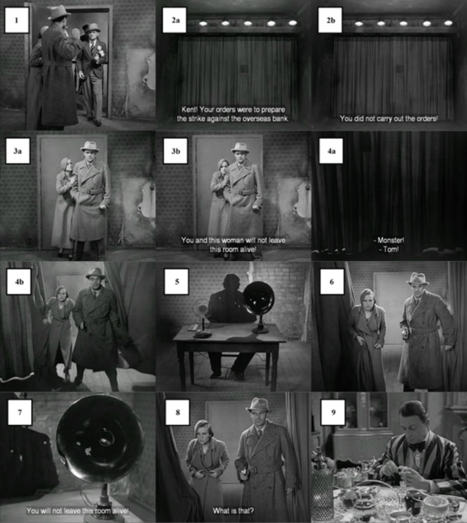 Lang’s consistent pattern of shooting this clearly established space means that when Lang eventually breaks this pattern, shooting, for the first time, from behind the curtain, the audience are just as caught up in the action as the characters. This ordering of shots adds a delayed reveal to the audience, increasing the tension and drama of the scene, before we see what lies beyond the curtain we see Kent and Lilli’s shocked reaction to it. Lang witholds the reverse shot for as long as possible, using off-screen space to increase the audiences engagement with the film. This pattern that has been established when shooting this space and the subsequent breaking of this pattern at this moment of reveal shows how an example of how Lang carefully and precisly used fragmentation and the sequencing of shots to weave not only the narrative of the film but also the form and structure and the effects that this has on the audience.