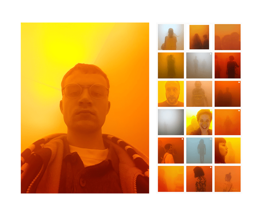 Take for example the recent Tate Modern retrospective on Danish-Icelandic artist Olafur Eliasson, In Real Life. This incredibly popular exhibition ran from the 11th July 2019 to the 5th January 2020 and during this time Instagram was awash with orange-tinged selfies from an installation at the centre of this exhibition, Din blinde passager (Your blind passenger), a 39 metre long, fog filled corridor. Once inside this corridor you are engulfed in a thick fog which fills the room, making everything beyond a metre and a half ahead of you impossible to see, over the course of the journey from one end of the room to the other the fog begins to turn orange and then blue, creating a uniquely uneasy and exciting experience as you slowly stumble towards the doors ahead of you. It didn’t take long for this installation to become a hotspot for selfies and Instagram posts, the hashtag #YourBlindPassenger containing close to 1000 of these other worldly selfies, while many thousands more occupy hashtags such as #OlafurEliasson, #InRealLife, and #TateModern.